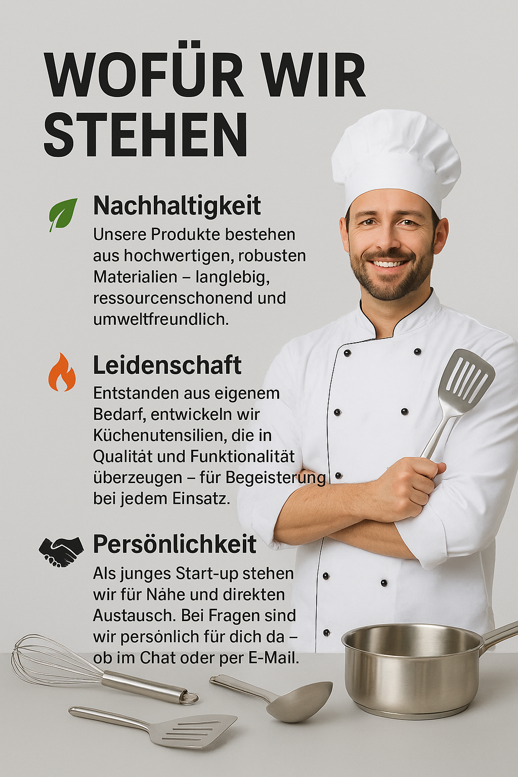 Entstanden aus eigenem Bedarf, entwickeln wir mit unseren Lieferanten Küchenutensilien, die in Qualität und Funktionalität überzeugen – für Begeisterung bei jedem Einsatz.